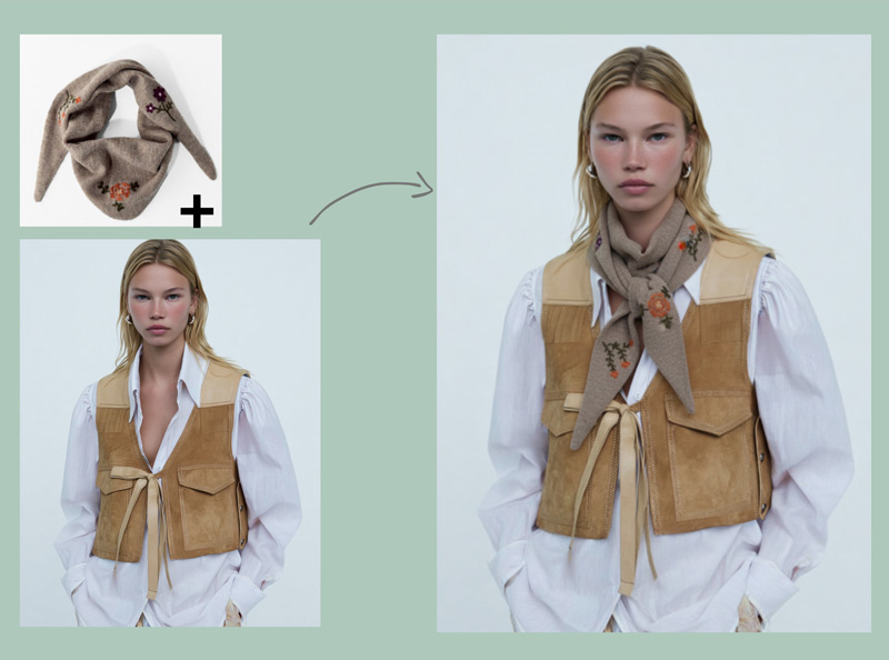 Garment positioning, prints and accessories on AI models